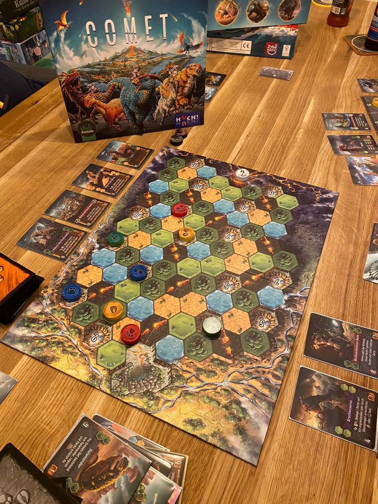 spannend integrierten Halmamechanik kennenlernen möchte, sollte hier mal einen Blick riskieren. Die Beantwortung nach der Frage der Zielgruppe fällt mir ein wenig schwer. Am ehesten scheint es mir dort verordnet zu sein, wo sich die Spiele des Kennerspiel des Jahres wiederfinden. Mit einem minimal schlankerem Regelwerk (etwa durch das weglassen der goldenen Karten) würde es sich hier aber um ein Familienspiel handeln, was vielleicht die bessere Zielgruppe gewesen wäre. So schwebt der Komet etwas zwischen den Welten.