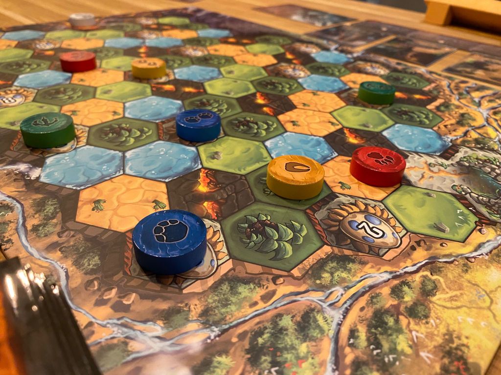 einfach nicht begeistert hat und ich auch nicht unbedingt von Grid Movement als Mechanismus begeistert bin. Auch die Grafiken der Karten haben mich zunächst nicht sonderlich angesprochen, da sie alle recht dunkel und ziemlich K.I.-generiert aussehen. Erstmals neugierig wurde ich dann durch das spielen von Faultier (2F-Spiele), da ich hier gemerkt hatte, dass Grid Movement durchaus auch interessant sein kann. Als ich dann mehr oder weniger zufällig auf der „Spiel Doch! 2025“ am Stand von Funtails eine Partie zu dritt spielen konnte, war ich ziemlich positiv überrascht und habe das Spiel anschließend auch eingesteckt.