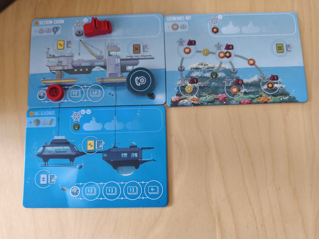 Zu Beginn ist der Ozean noch unerforscht und sehr überschaubar. Unser Boot befindet sich auf dem Startplättchen und hat eine Sonaraktion ausgeführt, um den Ozean zu erweitern. Die einzelnen Aktionen sind schön verzahnt und bieten viele Boni, so dass es sich lohnt, verschiedenen Strategien auszuprobieren.