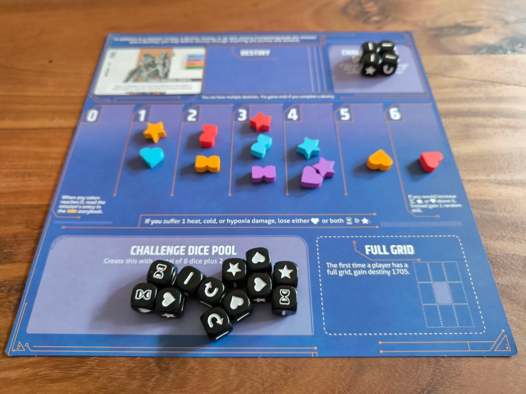 Um das Ende einer der kleinen Geschichten zu erleben muss ich dann aber entweder sehr gut würfeln oder spielmechanisch „schlau“ spielen. Vantage bietet euch nämlich die Möglichkeit die Symbole zu negieren. Dazu können Würfel auf Begleiter oder Ausrüstungsgegenstände die ihr gesammelt habt, auf bestimmten Feldern ablegt und damit ignoriert werden.