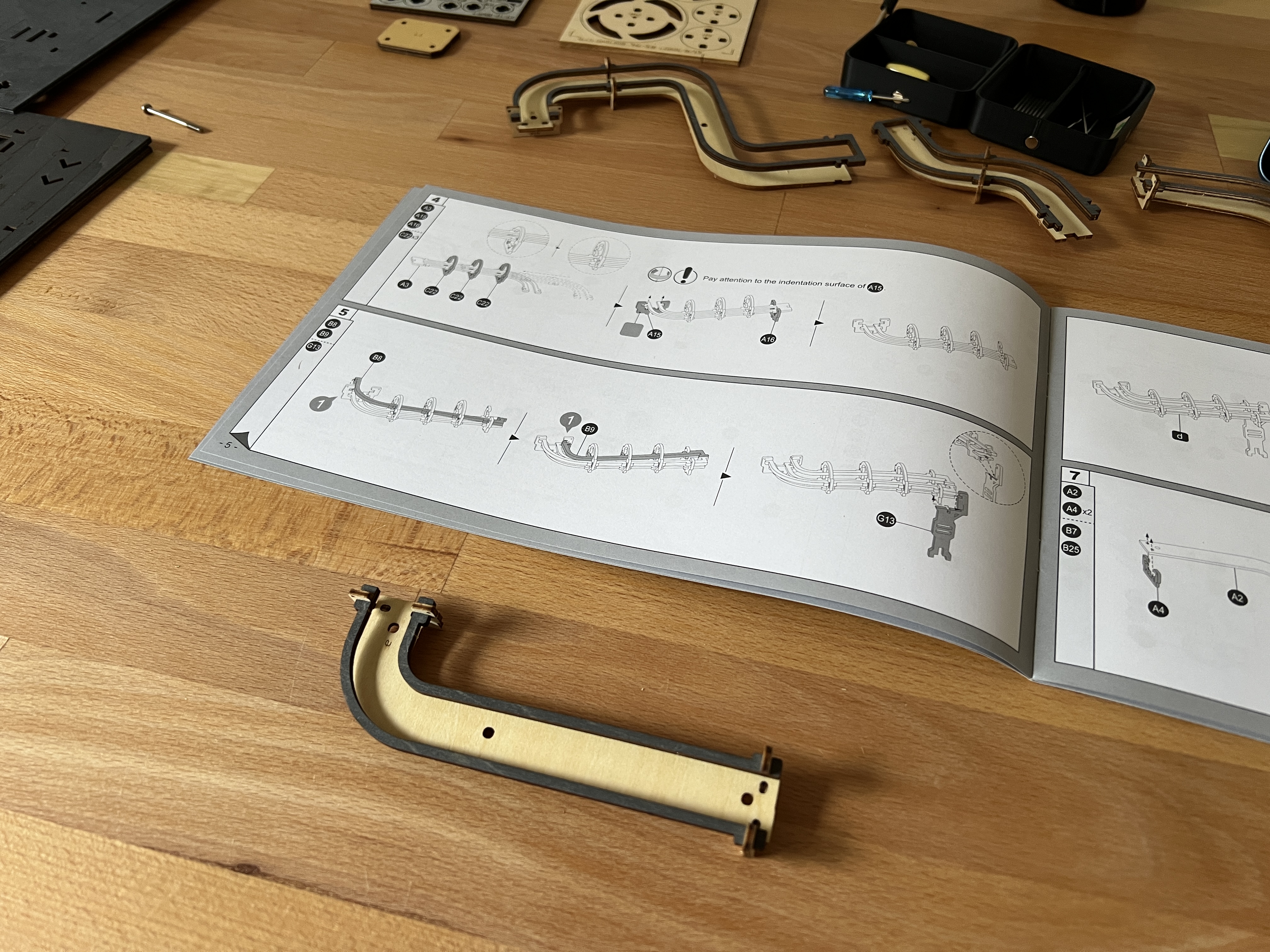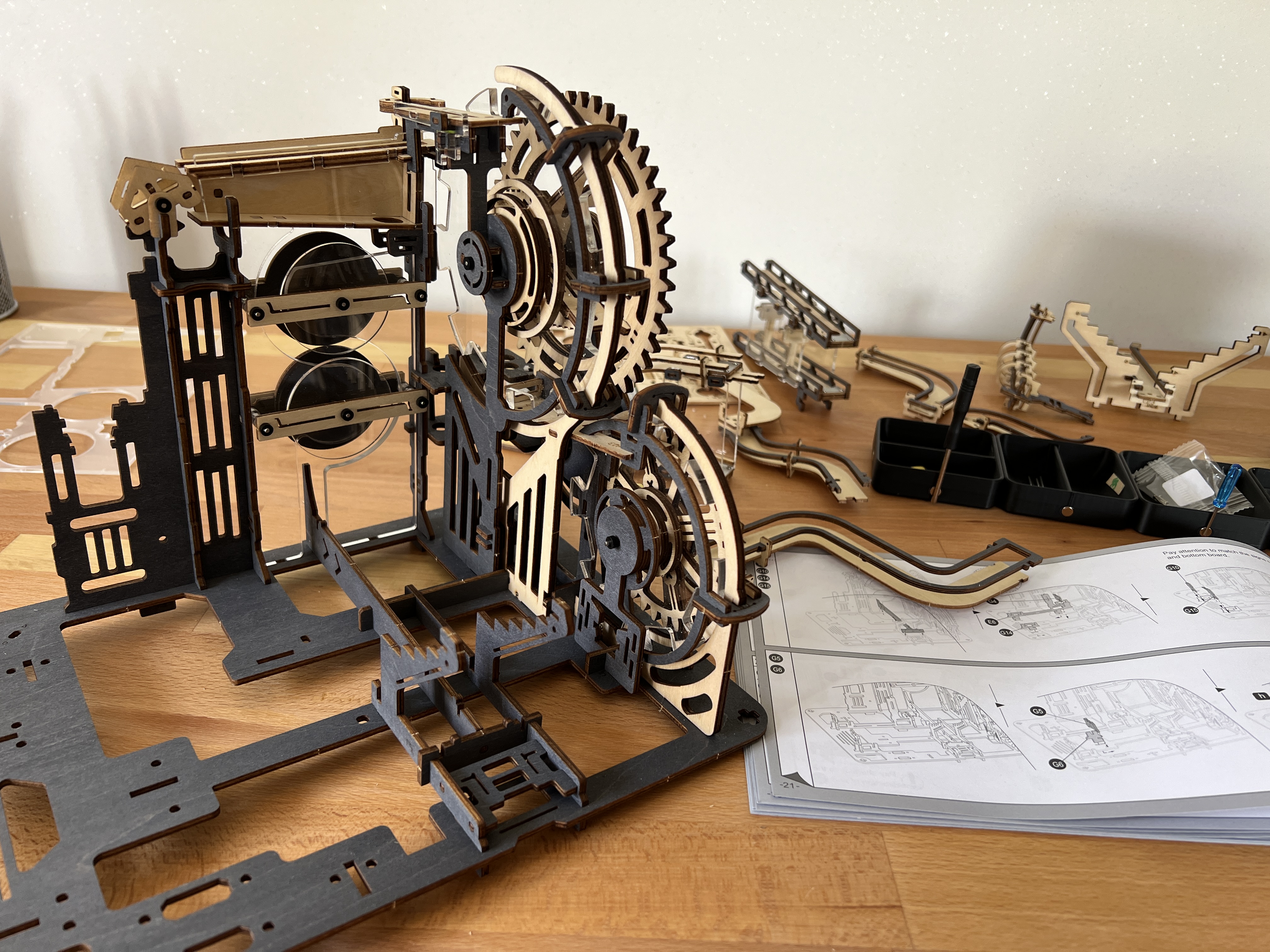 Ich glaube es war auf der Spiel 2024 als ich mit Dominik durch die Hallen gebummelt bin und wir an einem doch recht großen Stand mit verschiedensten Holzpuzzeln hängen geblieben sind. Hier fielen uns direkt die doch sehr filigran und gleichzeitig echt wertig anmutenden Kugelbahnen auf. Ab diesem Punkt war mir eigentlich klar, das möchte ich haben.