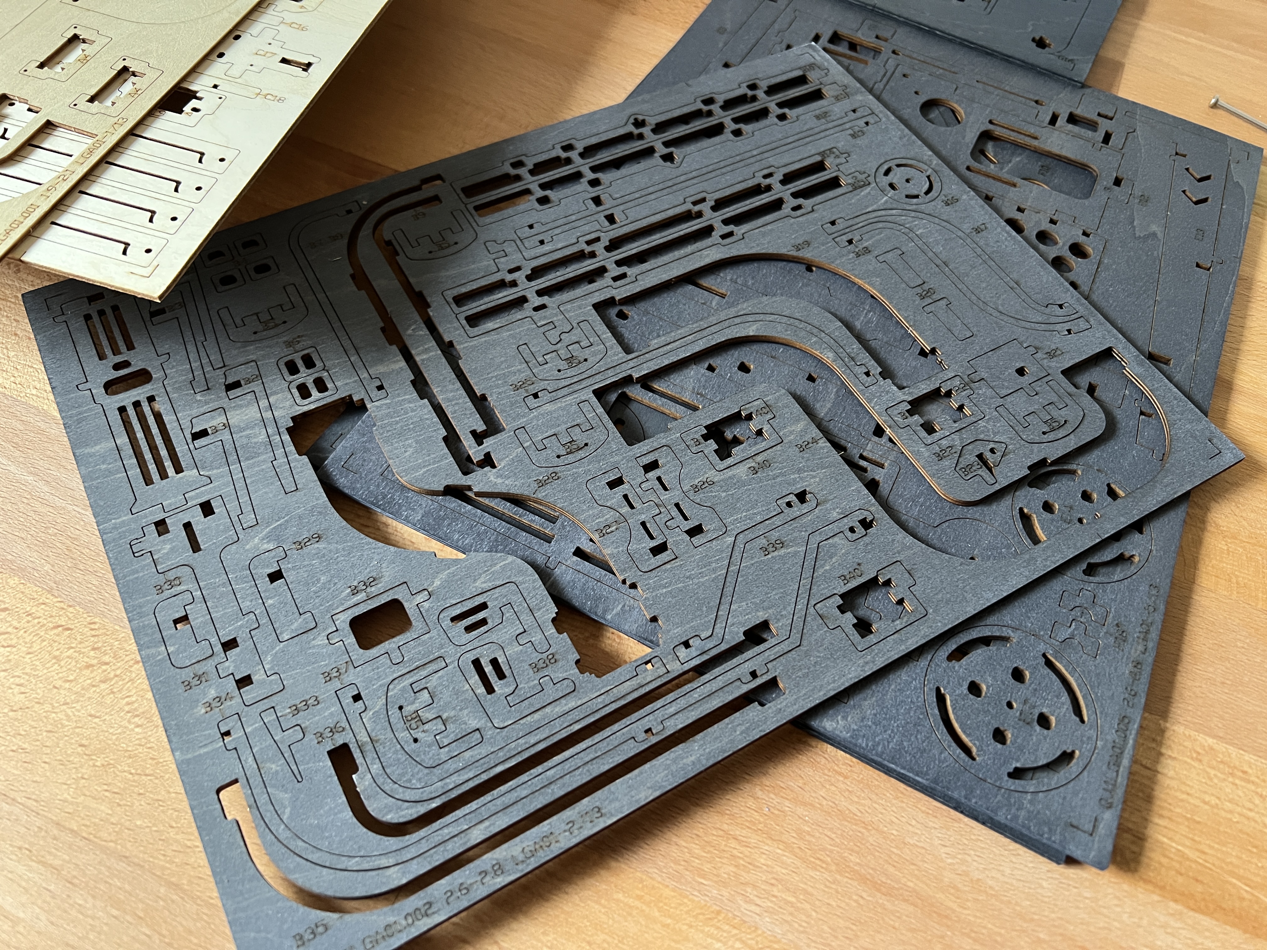 In der Box befanden sich dann mehrere Holz- und auch Plexiglasplatten, aus denen die verschiedenen benötigten Bauteile ausgestanzt werden mussten. Für uns Brettspieler ist das Auspöppeln zum Glück ja kein Problem.