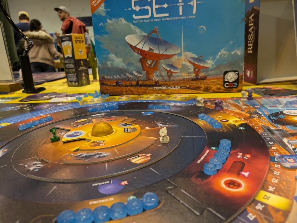 SETI war eigentlich auf der letztjährigen Messe (2024) an mir vorbei gegangen. Doch schon kurz nach der Messe mehrten sich die Stimmen das dies doch ein ziemlich guter Eurotitel des Jahrgangs sei. Sci-Fi, Weltraum, Aliens und es ist ein Euro…wie konnte mir das durchgehen?! Im Fachhandel ausverkauft habe ich mich dann am Sekundärmarkt bedient.