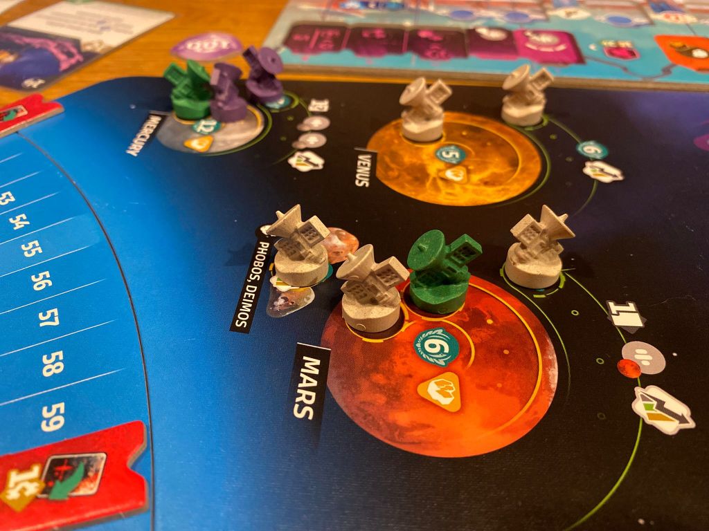 Es wird reihum über 5 Runden gespielt, wenn ich dran bin habe ich eine Hauptaktion und beliebig viele Nebenaktionen. Habe ich keine Ressourcen mehr (Karten, Energie, Credits) und kann auch ansonsten nichts mehr tun, passe ich. Im Grunde simpel, nur Aktionen gibt es reichlich und das abwägen welche mich am weitesten bringt macht mich auch nach Partie 25 noch komplett wahnsinnig! Denn: In SETI kommt man oftmals an den Punkt sich entscheiden zu müssen durch eine Aktion verdammt viele Punkte abzustauben oder sich durch eine Reihe von Effekten dauerhafte Vorteile für den weiteren Spielverlauf zu sichern um im Bestfall noch mehr Punkte machen zu können. Es gibt viele Wege in diesem Spiel die nicht zuletzt auch durch die Rotation unseres Sonnensystems beeinflusst werden. Weil nämlich: als Konsequenz einiger Aktionen rotiert unser Sonnensystem. Abgefahren! Denn das bringt hier ordentlich Musik ins Spiel. Es rotieren nicht alle Planeten synchron, sondern hierdurch bilden sich neue Planetenkonstellationen, wie im echten Leben also…oder so ähnlich. Das heißt das meine Sonden evtl. ihr Ziel anpassen müssen, bestimmte Planeten für mich auf einmal unerreichbar werden oder das Scannen eines Sektors für mich auf einmal nicht mehr möglich ist. Die großen Boni gibt es für das finden von Spuren Außerirdeschen Lebens. Und ja Mensch nochmal, ist dass thematisch, genau darum soll´s ja auch gehen! Diese Spuren bekommt man durch das Landen auf Planeten, dass Scannen von Sektoren oder durch das Sammeln von Daten. Sind ausreichend Spuren gesammelt erscheint erst eine Alienrasse und im weiteren Spielverlauf die zweite.