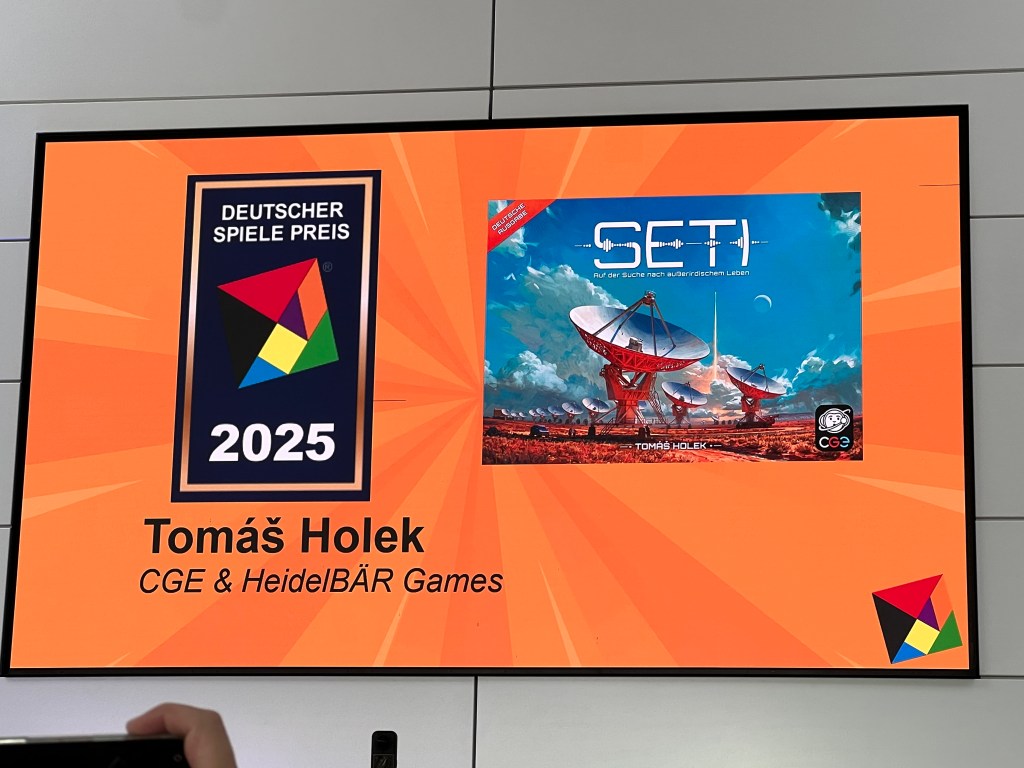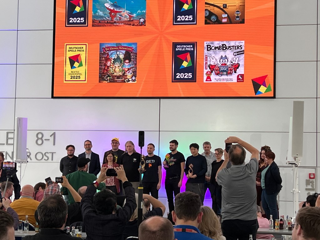 Abschließend folgte die Preisverleihung des Deutschen Spielepreises. Während der Kinderpreis mit „Die kleinen Alchemisten“ bereits bekannt war, waren bisher nur die Top 3 des Spielepreises bekannt. Gewonnen hat schlussendlich „SETI“ vor „Endeavor“ und „Bomb Busters“. Witzige Anekdote: CGE hat eine Anmerkung erhalten, dass die Anzahl der Trabanten um den Saturn auf einer Karte falsch wäre. CGE hat hier nachgeforscht und festgestellt, dass zwischen der Erstellung des Spiels und jetzt 15 neue Monde hinzugekommen sind. Dieses wird mit der nächsten Ausgabe korrigiert.