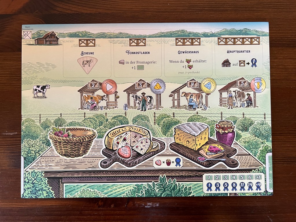 Jeder Spielende erhält ein individuelles Playerboard. Der Aufbau der Playerboards ist identisch. In 3 verschiedenen Bereichen können wir beispielsweise unsere Käserei ausbauen, um zusätzliche Fähigkeiten zu erhalten, in Melkständen zusätzlichen Käse produzieren oder unseren Käse mit Früchten verfeinern. Der Unterschieid beschränkt sich auf den Playerboards auf den Bereich des Käsereiausbaus. Hier bekommt jeder Spielende andere Möglichkeiten die eigene Käserei auszubauen und somit andere Fähigkeiten.