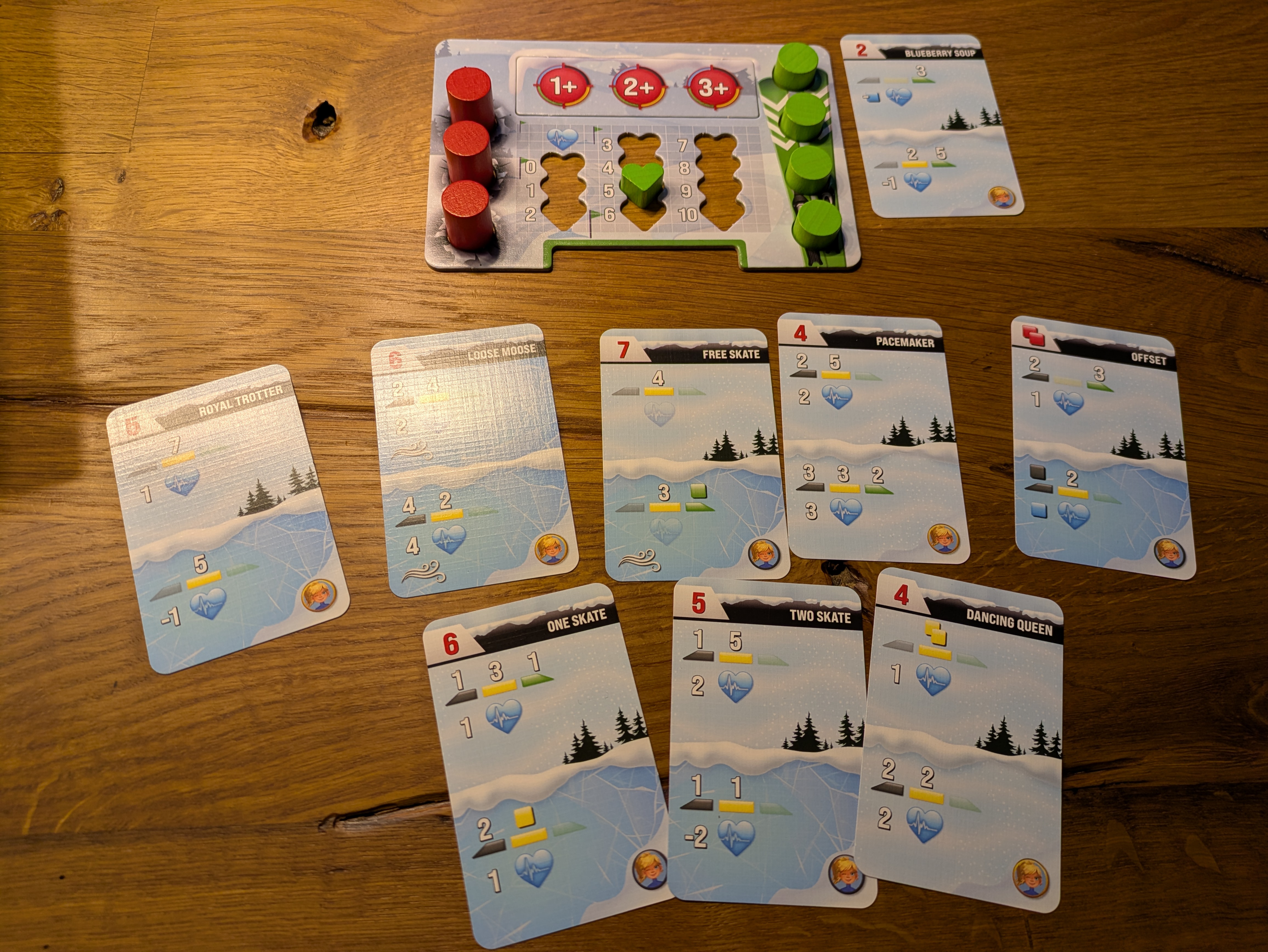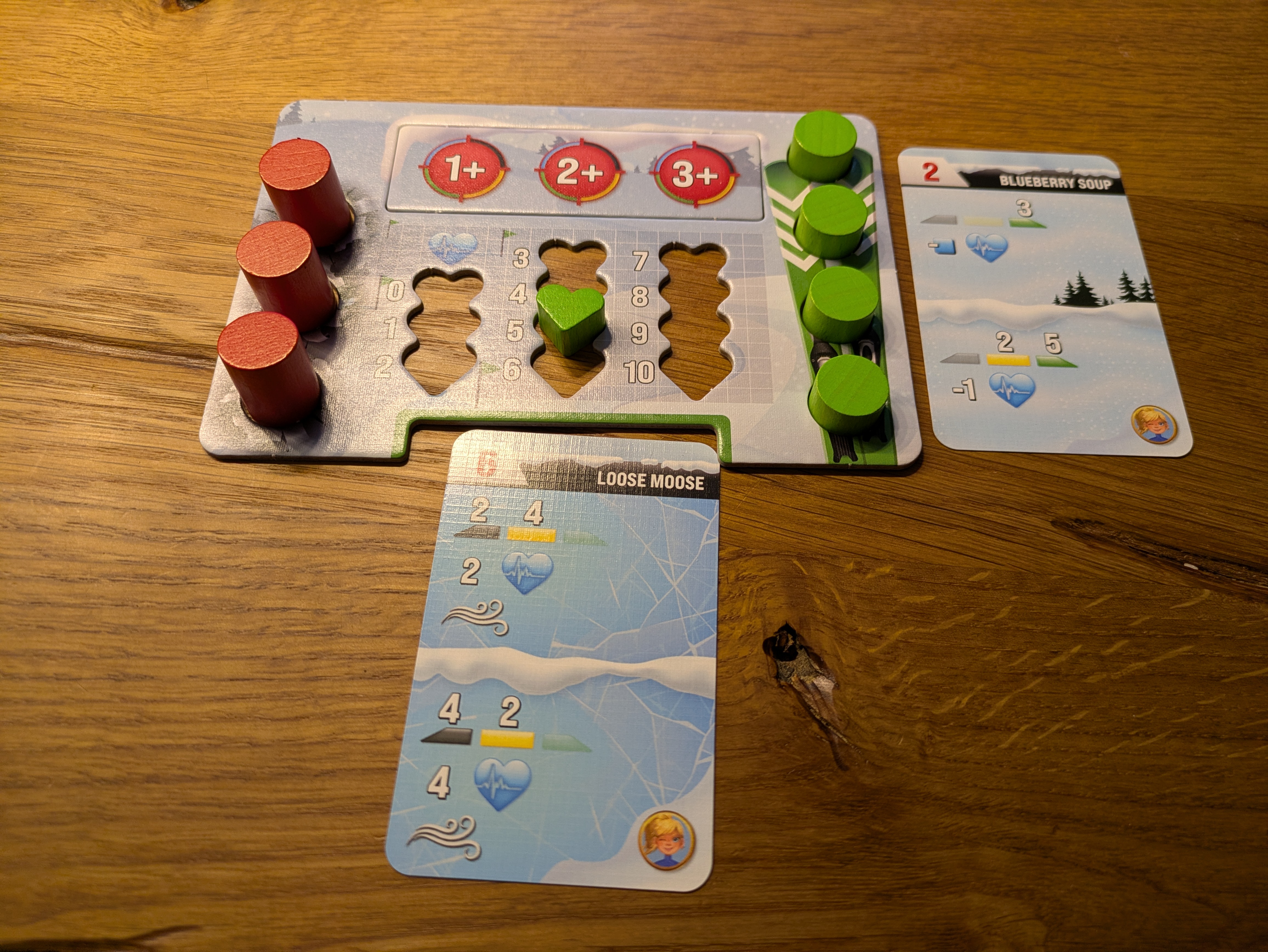 Das Skilaufen wird hier durch Karten dargestellt und wer Heat mag wird sich hier wohlfühlen. Gleichzeitig suchen wir uns alle eine Karte aus, die gespielt werden soll und laufen maximal so viele Schritte, wie auf dieser abgebildet sind. Starten darf die Person mit der höchsten Initiative auf der Karte. Gleichstände werden immer anhand der Farben abgehandelt. Zuerst rot und dann in der Reihenfolge schwarz, gelb, grün, blau und weiß. Der Kniff an den Karten sind die möglichen Schritte. Nicht jede Karte lässt mich bergauf laufen, dafür aber vielleicht so richtig bergab düsen. Andere können alles ein bisschen. Will ich schnell bergauf, steigt mein Puls, bergab sinkt er meistens wieder. Üblicherweise dürfen die Karten dürfen wiederverwendet werden, manche sind jedoch nur einmalig. Da wir zu Beginn alle außer einer Karte auf der Hand haben, kann man theoretisch recht gut seine Runde bis zum Schießstand planen. Wenn da nicht die anderen am Tisch wären…