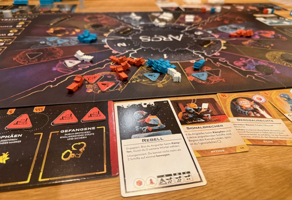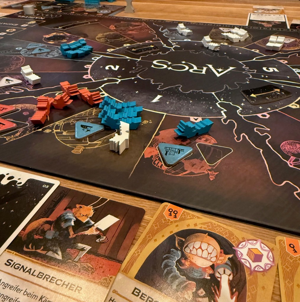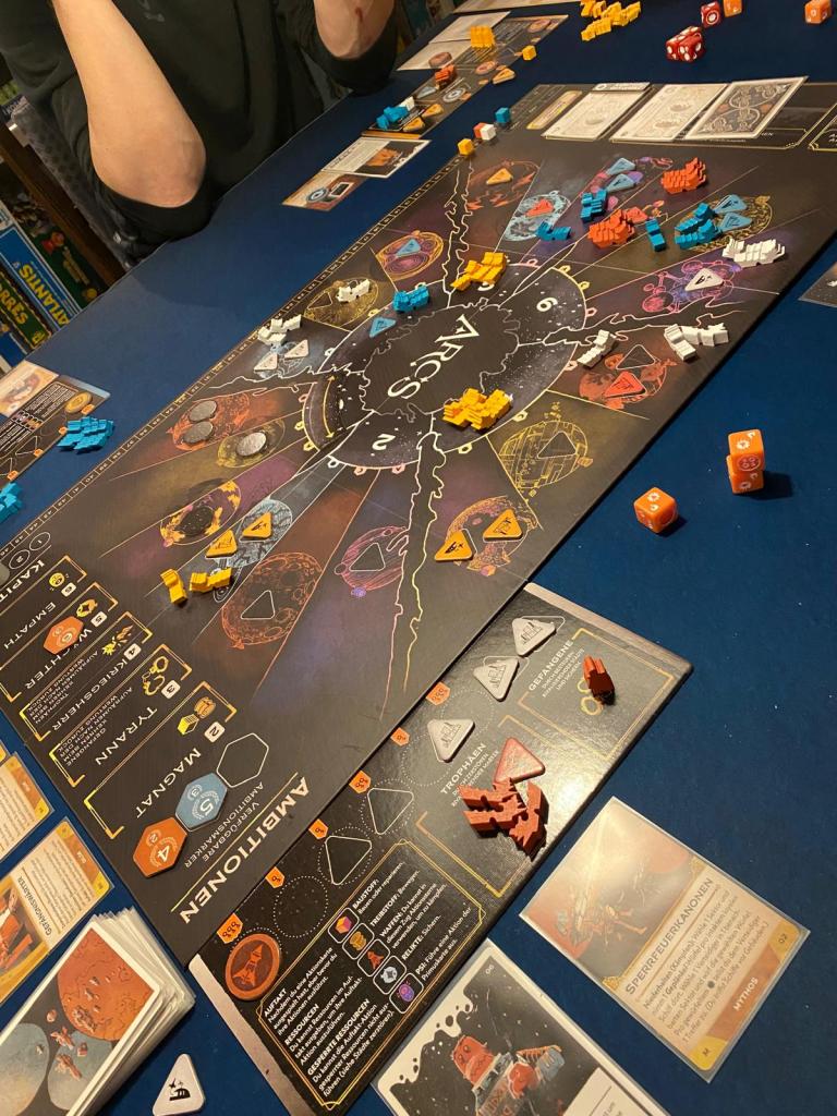 Ich bin eigentlich überhaupt kein konfrontativer Spielertyp. Egal in welchem Spiel, ich versuche aufzubauen, setze auf Wissenschaft oder Bündnisse. Bei 7 Wonders gehe ich auf grün, bei Scythe gibt es für mich keine Sterne fürs Kämpfen. Aber Arcs packt mich und so recht weiß ich nicht warum. Diese durchgängige Spannung, die Bedeutung jeder einzelnen Entscheidung und das richtige Maß an Glück ziehen mich voll in den Bann. Eine epische Schlacht mit einzigartigen Momenten, ohne Materialschlacht. Viele erinnerungswürdige Züge in einer nicht kurzen, aber überschaubaren Spielzeit. Ich liebe komplexe Spiele, die nicht kompliziert sind und mit wenigen und einfachen Regeln daherkommen. Das bietet Arcs in Perfektion.
