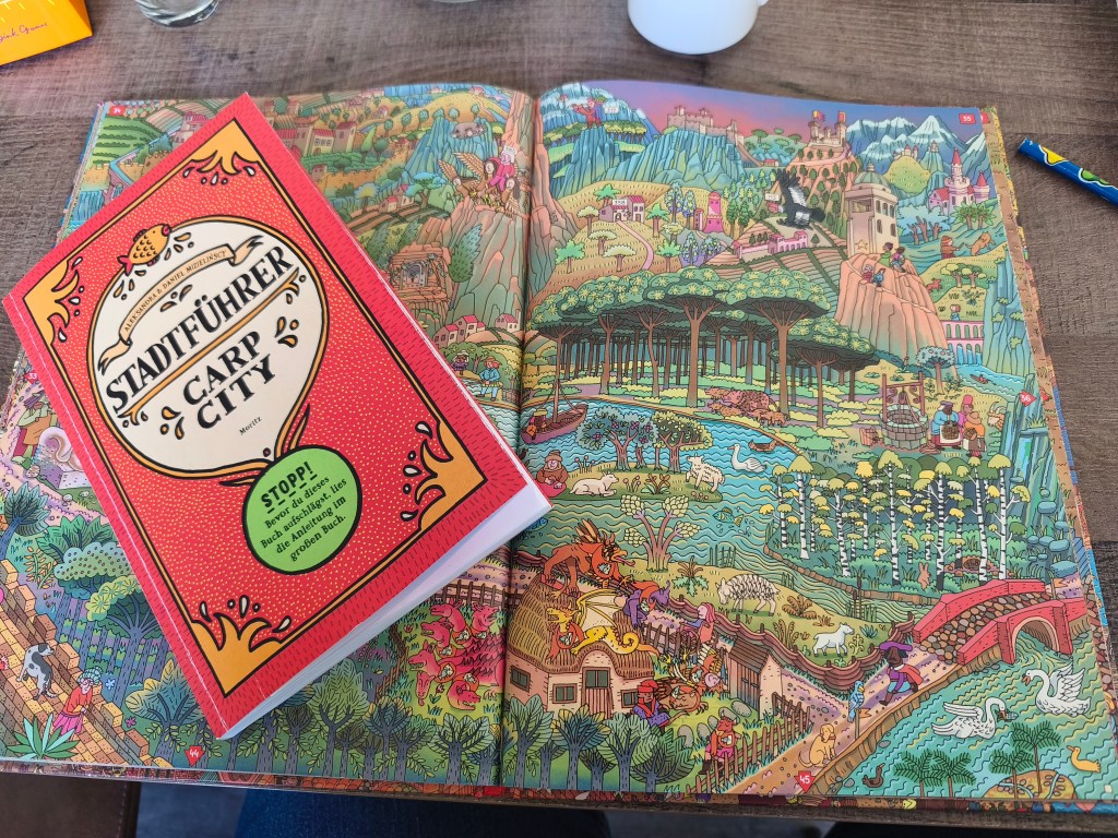 Bei Carp City handelt es sich um eine Mischung aus Spiel- und Wimmelbildbuch. Vergleichbares habe ich tatsächlich noch nicht gesehen und dementsprechend war ich ziemlich neugierig, als ich die ersten euphorischen Spielberichte las. Spiel? Ja, Carp City ist ein Spiel, wenn auch eines mit supereinfachen Regeln: Grundsätzlich besteht es aus einem großformatigen Bilderbuch und einem kleineren Stadtführer. Das große Buch zeigt eine bunte, liebevoll gezeichnete Stadt. Jede Doppelseite enthält zahlreiche Szenen, die mit Nummern gekennzeichnet sind. Die Nummern verweisen auf Einträge in dem beiliegenden Stadtführer. Dort können wir immer nachlesen, was es mit der Szene auf sich hat und bekommen dann meistens weitere (Such-)Aufgaben, die sich auf andere Stadtbereiche beziehen. Manchmal bekommen wir auch Stichwörter, die wir in einer Liste abhaken oder wir finden Gegenstände, die wir in unseren Rucksack legen dürfen. Sowohl die Stichworte als auch die Gegenstände werden dann in anderen Szenen relevant und so arbeiten wir uns Miniquest für Miniquest durch die quietschbunte Zauberstadt.
