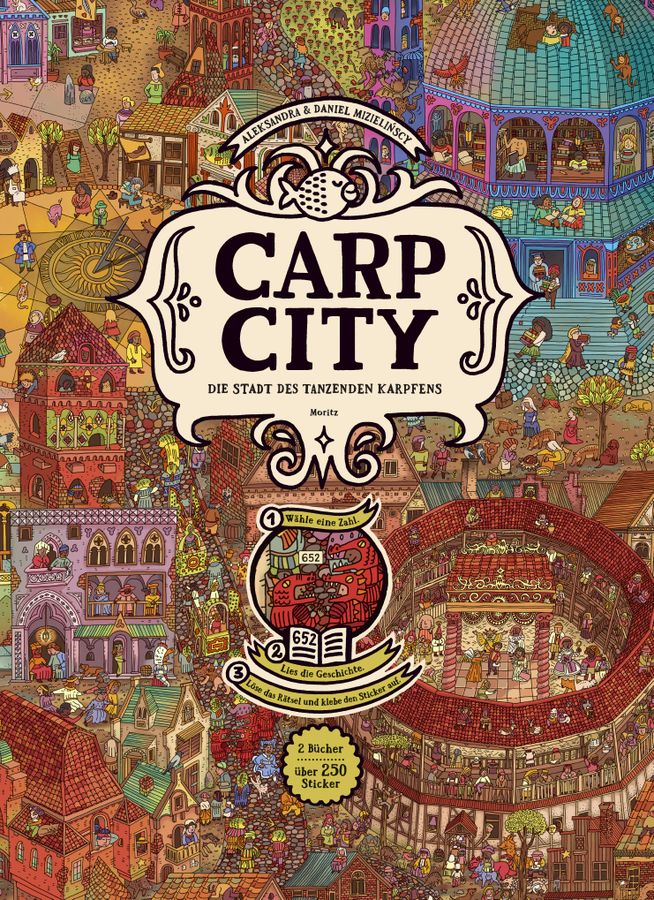 Mich hat in den letzten Wochen das Stickerfieber gepackt und ich habe mit sehr viel Freude die Stadt des tanzenden Karpfen erkundet. In dem knallbonbonbunten Wimmelbildbuch „Carp City“ verstecken sich zahlreiche niedliche Geschichten, die sich nach und nach offenbaren – und damit auch stundenlanger und ziemlich außergewöhnlicher Spielspaß.